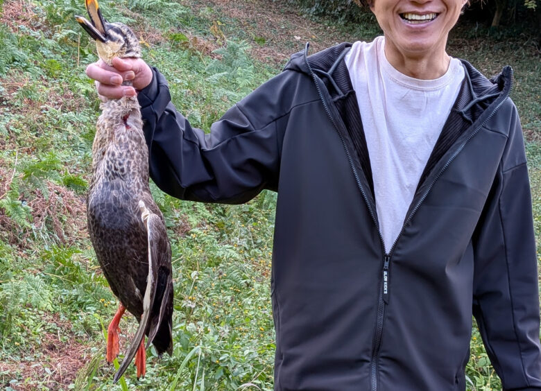 気持ちを切り替えてカモの猟場へ移動すると、最初の池では成果がなかったものの、二つ目の池でカルガモを二羽発見。飛び立った瞬間を狙い、散弾銃で一羽の捕獲に成功しました。