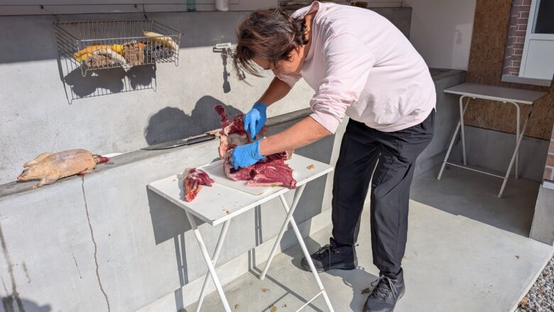 すぐにカルガモの羽根むしりと精肉に取りかかり、さらに念のために用意していたイノシシの足も解体することになり、現場は大忙し。