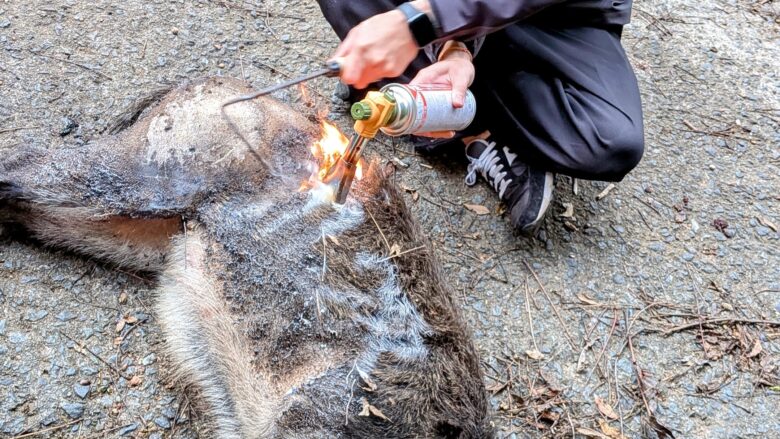 通常のイノシシの解体では、効率を重視して、毛の付いた皮ごとナイフで剥ぎ取る方法が一般的です。