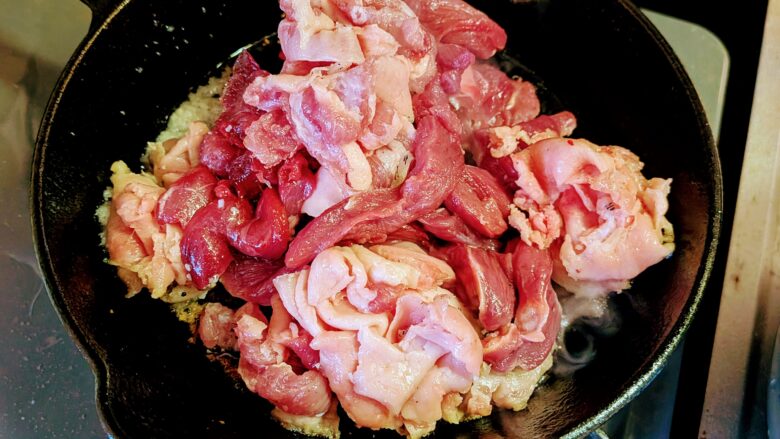 かつて、商品価値のなかった内臓を使った「もつ煮込み」が生まれたように、この「ねぶり」もまた、剥皮した後の皮に残った肉を余さず食べるために生まれた「猟師の賄い飯」です。