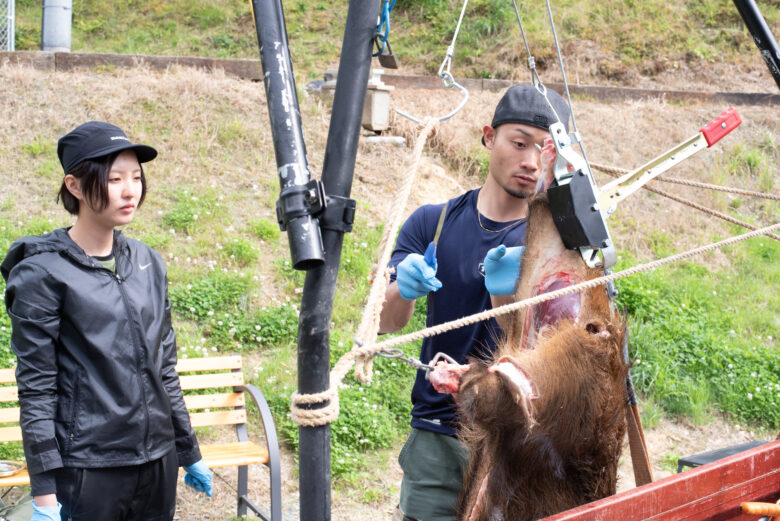 捕獲したイノシシやシカ、アナグマ、アライグマなどの獣を衛生的に解体して、食肉(ジビエ)へ加工するプロセスを習得します。